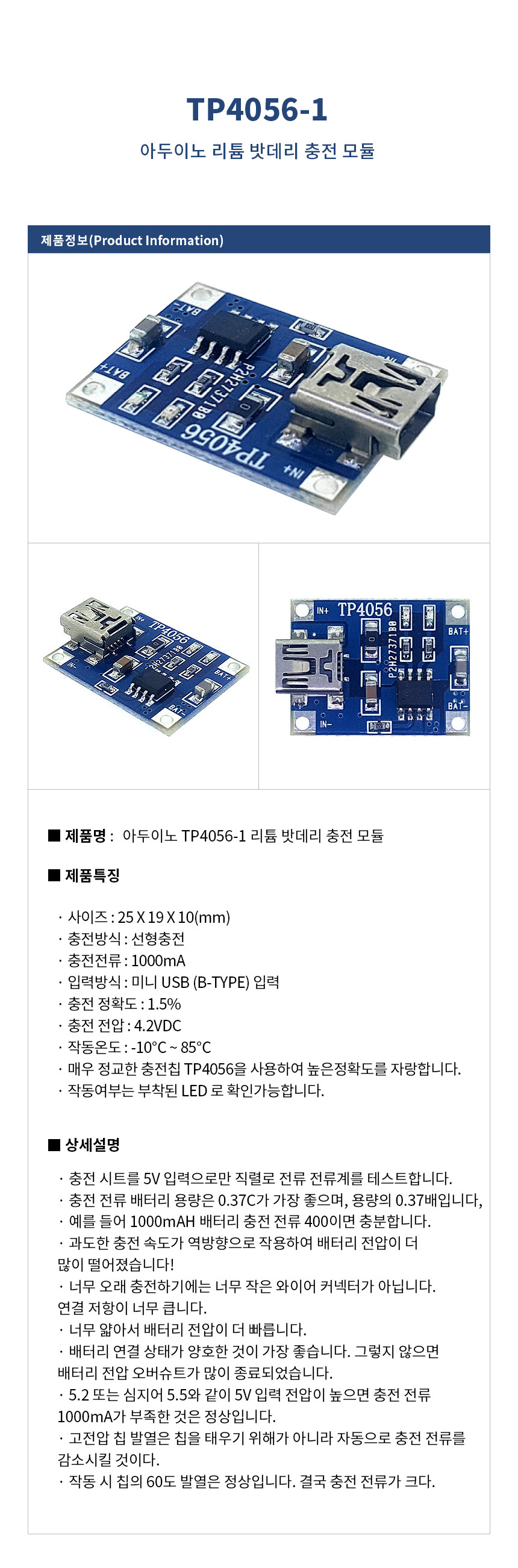 아두이노 TP4056-1 리튬 밧데리 충전 모듈