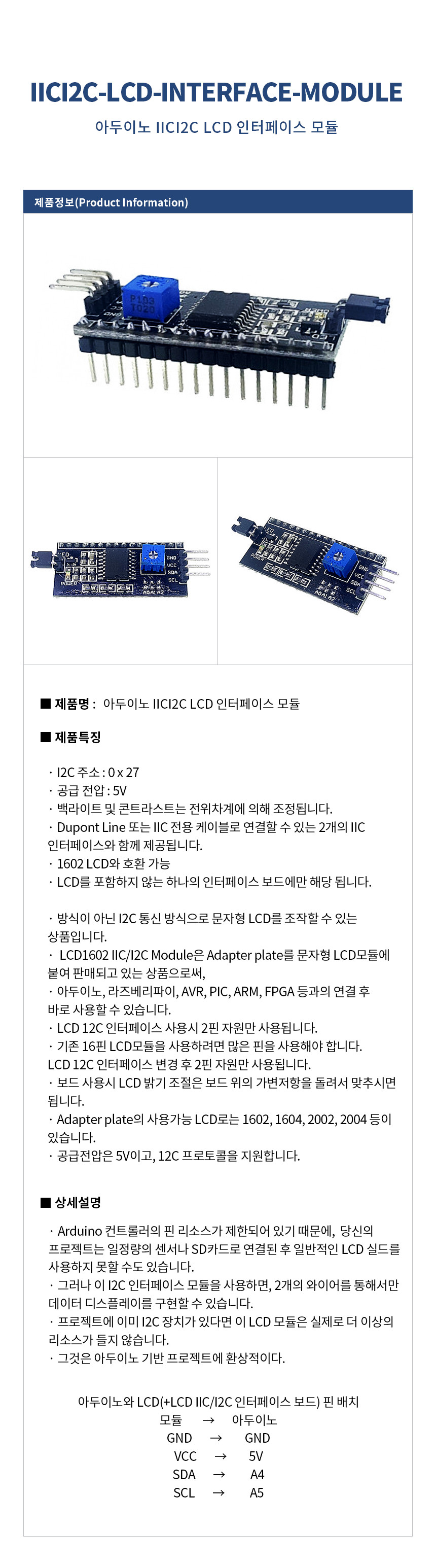 아두이노 IICI2C LCD 인터페이스 모듈 IICI2C-LCD-INTERFACE-MODULE
