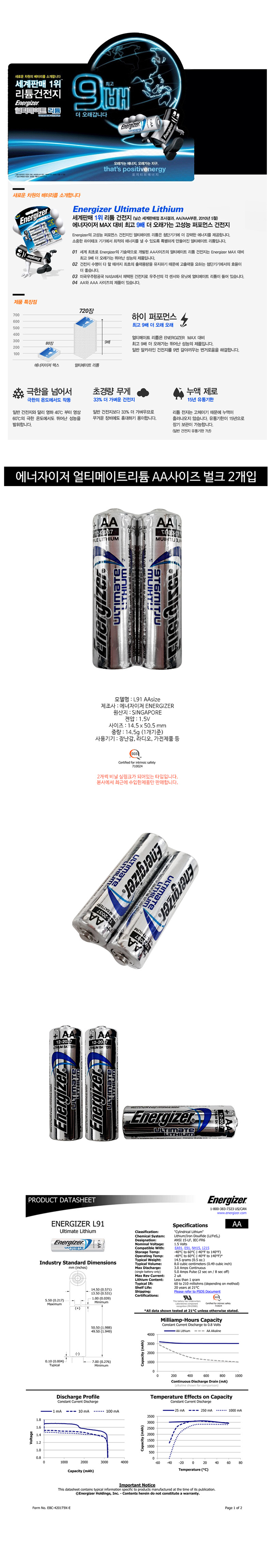 [건전지] 에너자이저 ENERGIZER 얼티메이트리튬 L91 AA사이즈 벌크 2개입 1.5V