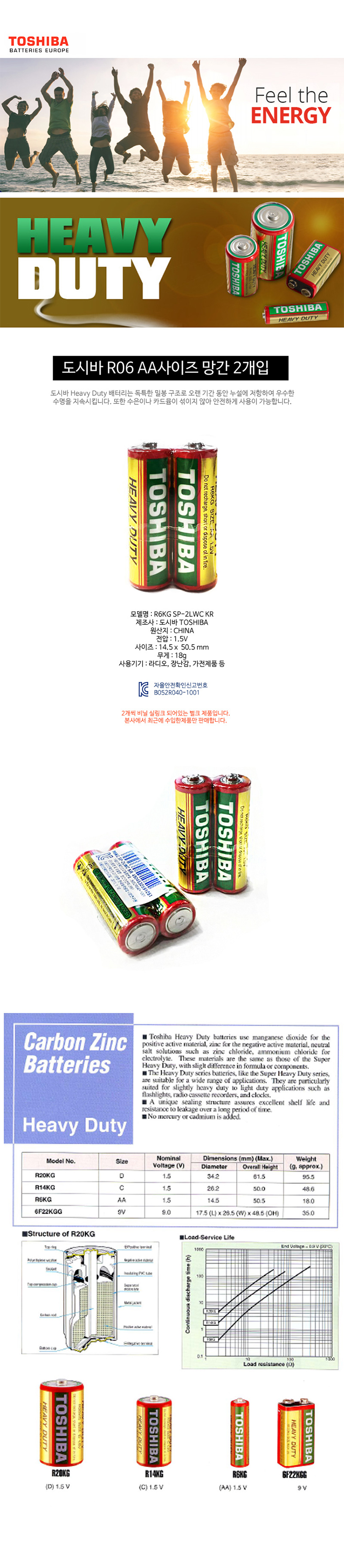 [건전지] 도시바 TOSHIBA R6KG SP-2LWC KR R06 AA사이즈 망간 벌크 2개입