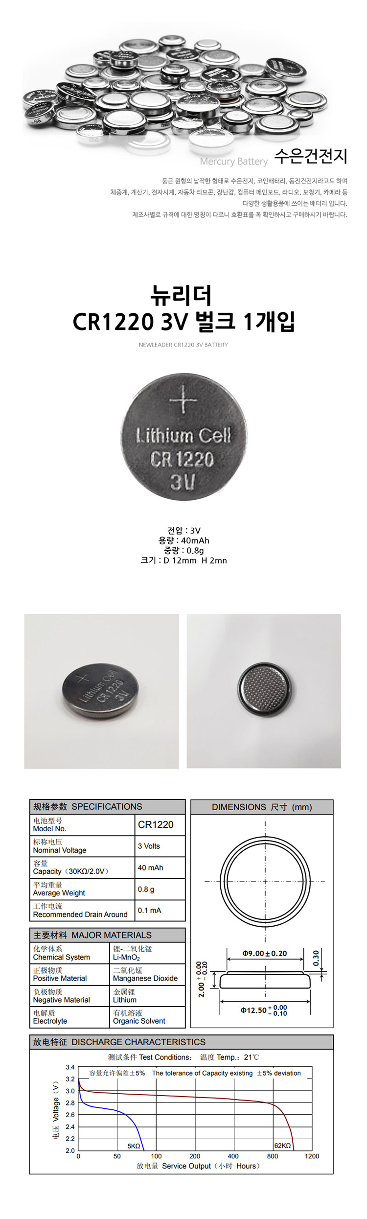 [수은건전지] 뉴리더 NEWLEADER CR1220 벌크 1개입 3V 36mAh
