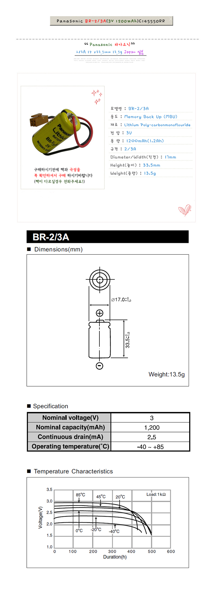 [리튬전지] 파나소닉 PANASONIC BR-2/3A(3V 1200mAh)C145550RB