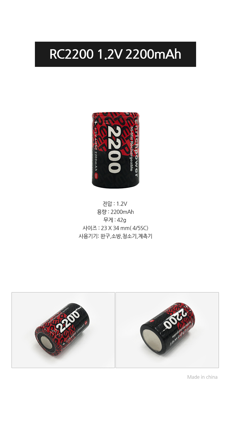 [Ni-MH충전지] 니켈수소 Ni-MH RC2200 1.2V 2200mAh 4/5SC 사이즈 충전지