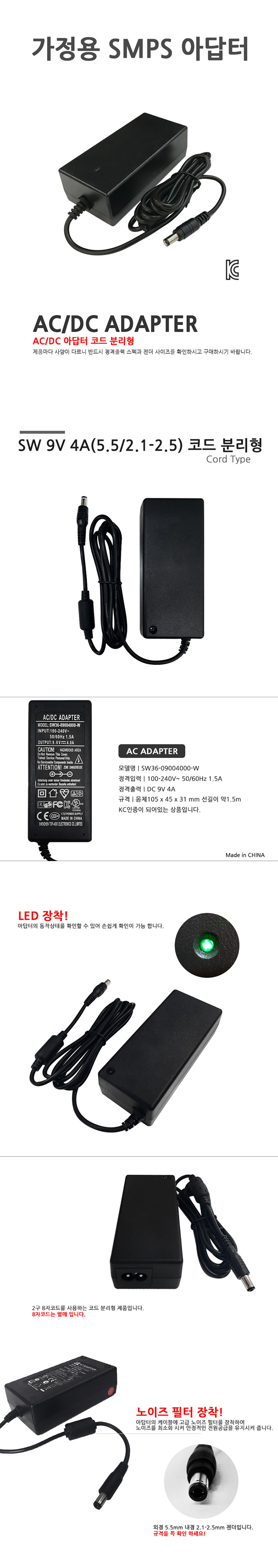 [전자식 아답터] 에스더블유 SW 9V 4A 코드분리형