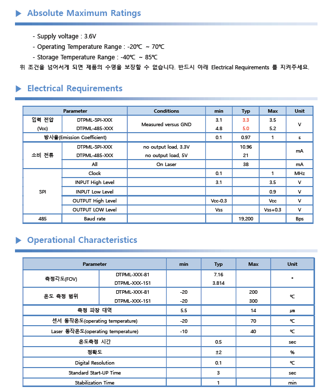 비접촉, 원거리측정 , DS ratio : 15:1 , -20~270℃/ SPI통신 , 분해능 0.1℃ , 레이저포인터 기본 장착