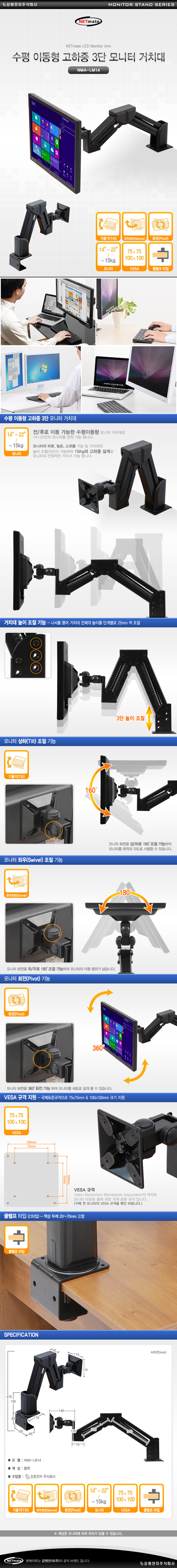NETmate 3단 모니터 거치대 수평 이동형 고하중 NMA-LM14